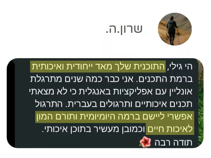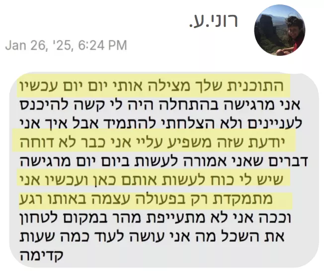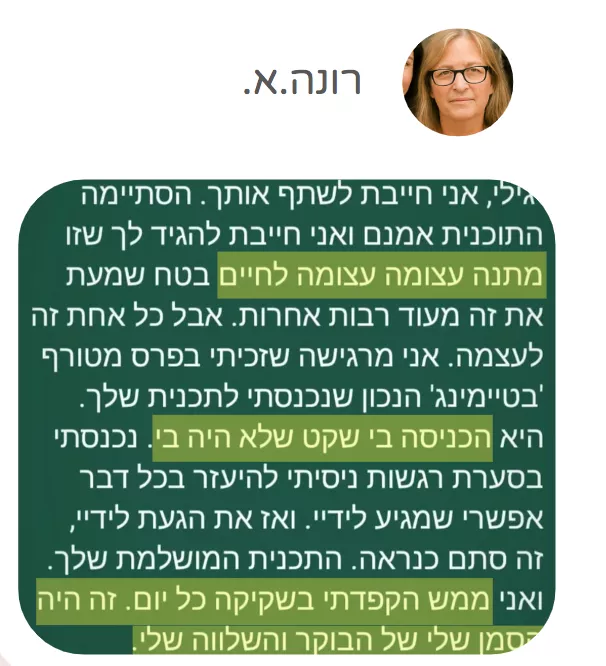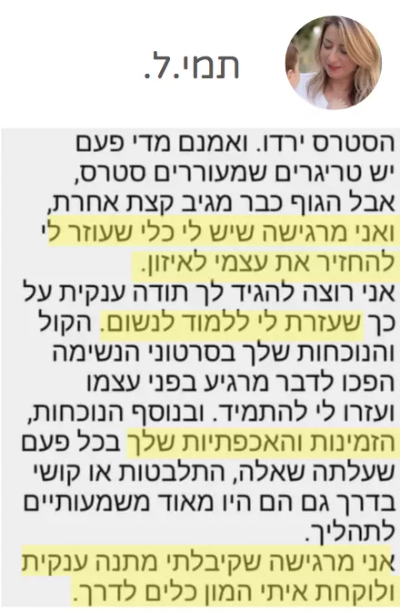 במהלך התוכנית תוכלי לחזור לחיות את החיים שלך באופן מלא ומשמעותי. תיזכרי שוב איך זה לחיות בנינוחות, להנות מההווה ולחיות את החיים שלך בלי שאת סובלת מתסמיני המתח והסטרס.